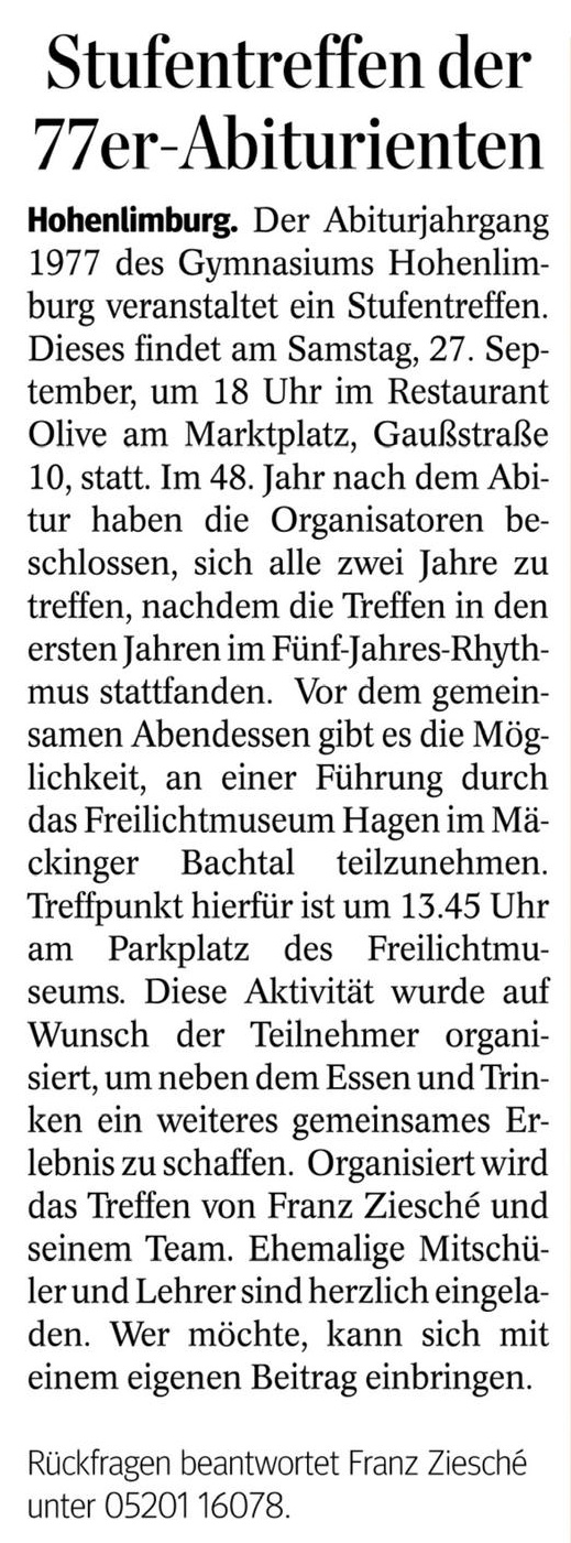 | Das 48-Jahr-Treffen der Abiturientia '77 (das 14. insgesamt) hat am Samstag, 27. September 2025, in der Gaststätte "Olive" am Marktplatz von Hohenlimburg, wo auch schon die Treffen 2012 und 2017 veranstaltet wurden, mit insgesamt 28 Teilnehmern stattgefunden. | |||||||||||